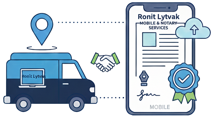 I complete the notarization, review everything for accuracy, and return your documents. Online notarized files are delivered securely, while mobile notarizations are completed on-site with your original documents.
